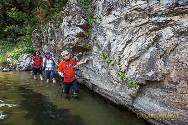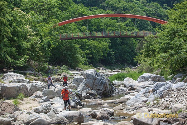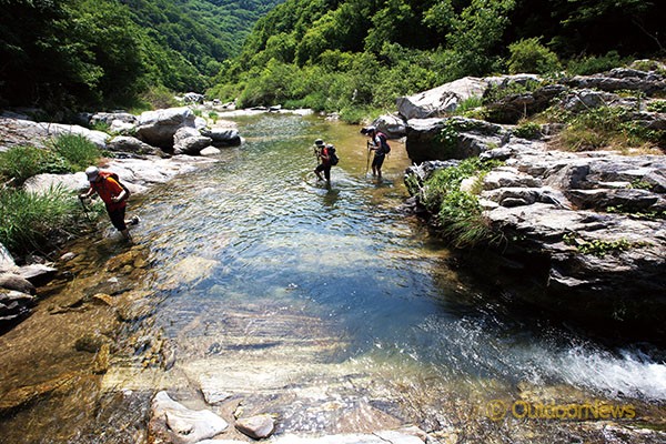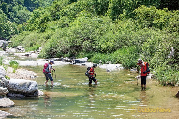계곡트레킹 시 미끄러지지 않는 신발은 필수다.