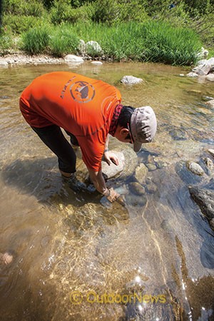 버들치를 잡기 위해 생수병으로 간이 통발을 설치하는 일행.