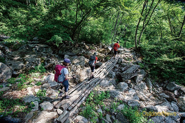 계곡을 따라 길게 난 산길을 잇는 통나무 다리.