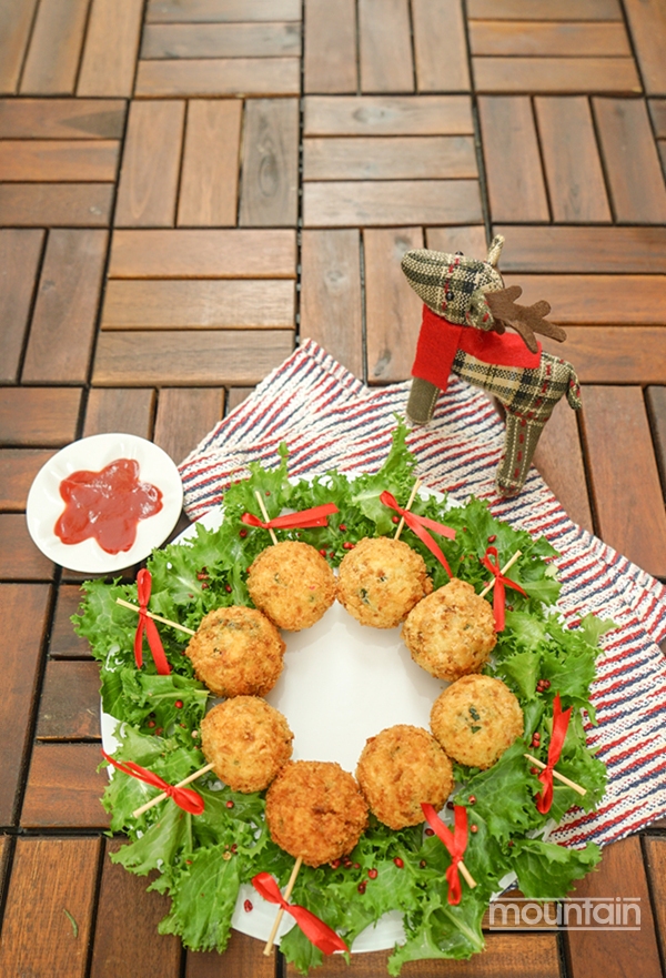 ⑤ 크로켓에 빨간 리본을 단 꼬치를 꽂아 장식해준다
